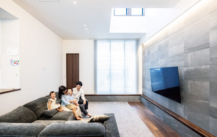 リビングでにぎやかに過ごすご家族。テレビは壁掛けにしてすっきりと