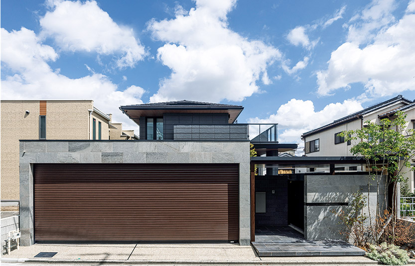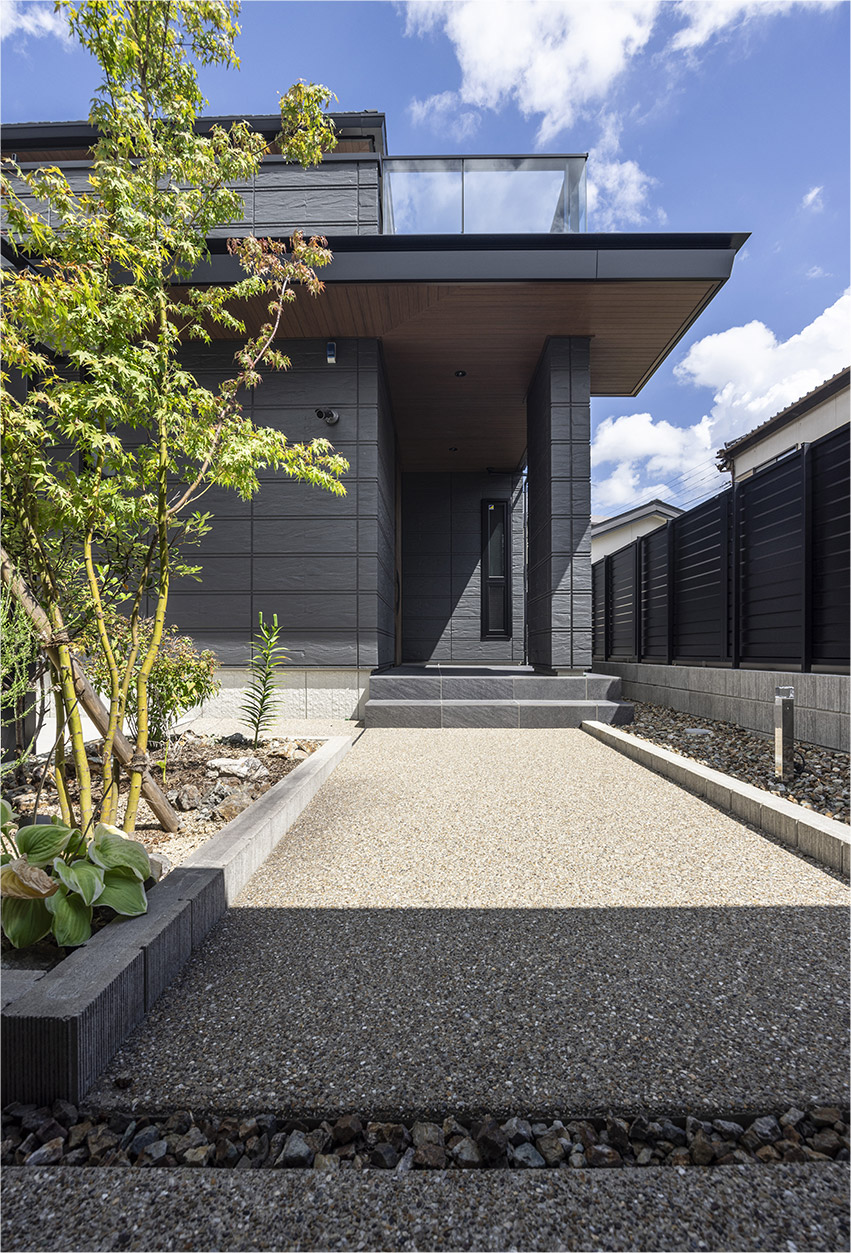 奧行きのある敷地を生かした、期待感の高まるアプローチ。正面に見える玄関ポーチは、深いキャノピー(庇)によって堂々とした雰囲気を演出しています。2階のルーフバルコニーの透明腰壁も、表情豊かな外観をつくるのに一役買っています。