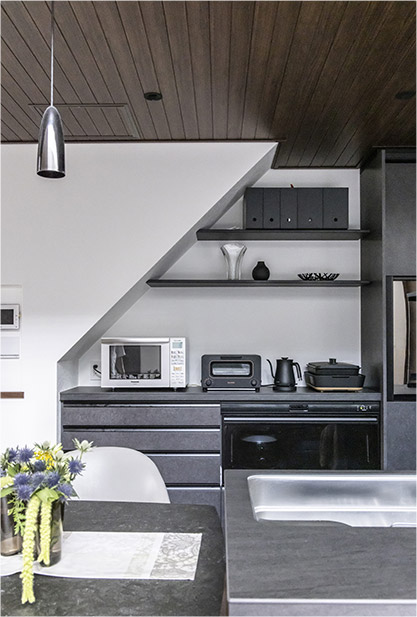 階段下の斜めのラインを生かした「見せる収納」。カップボードやカウンター、調理家電や収納用品はすべてモノトーンで揃えてすっきり見せています。