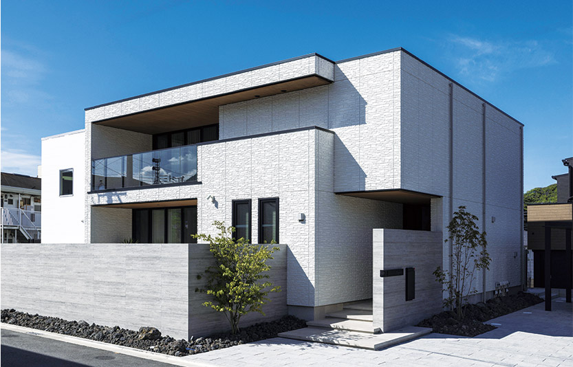 立體感のある外観シルエットに、陰影豊かなオリジナル外壁「ベルサイクス」が映えています。塀はプライバシーに配慮して高めに設定していますが、杉板型押しの質感によってデザイン性を高め、圧迫感を感じさせません。