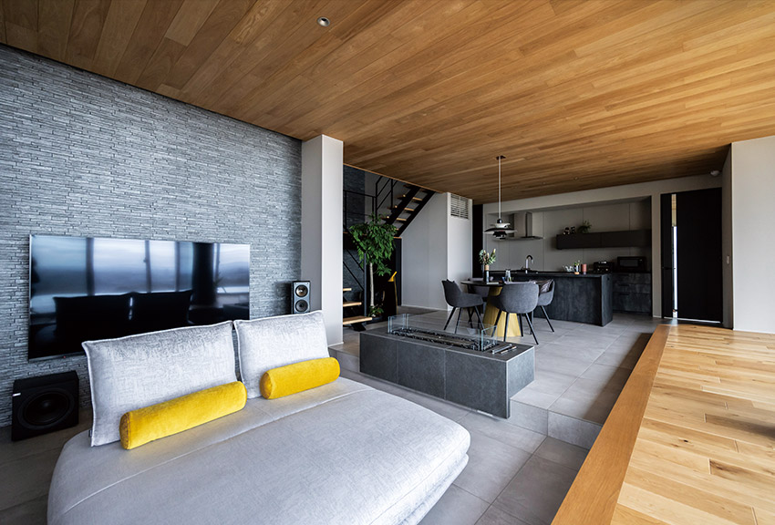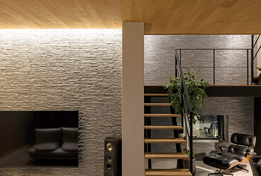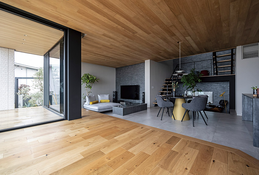1階の板の間は節目のあるオークを採用し、突き板の素材感を生かしたナチュラルな雰囲気に。天井は落ち著いたイメージにするため、節目のないものを張っています。床にはグレーの大判タイル、リビングや階段後ろのアクセント壁には質感豊かなタイルを選ばれました。さまざまな自然素材が調和した、上質感のある空間をつくりました。