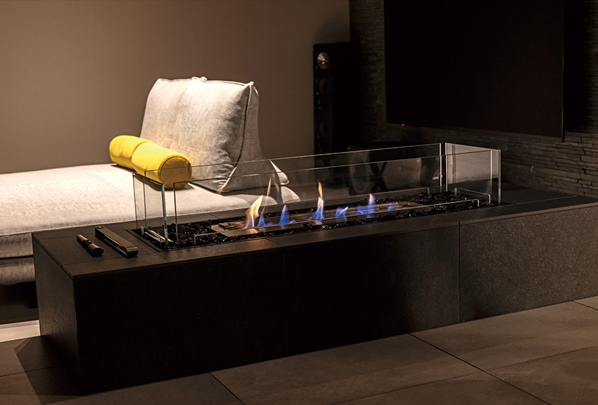 新居には暖爐が欲しいとお考えだったYさま。設置の條件やお手入れの方法などを考慮し、バイオエタノール暖爐を採用されました。ソファに座って揺らめく火を眺めるひとときは、至福の時間です。