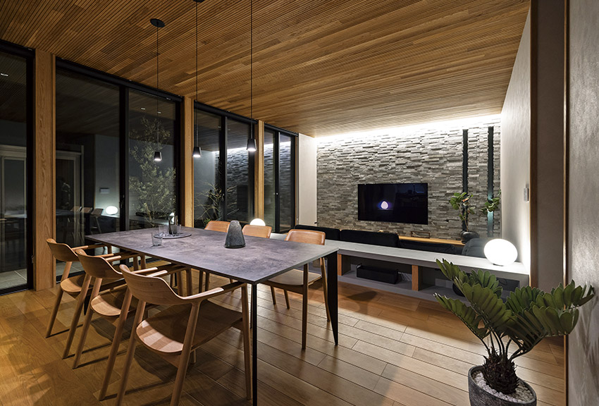 LDKで大切にしたのは、「重みのある照明計畫」。間接照明を活用し、必要な部分に必要な明るさを確保して、心地よく集える雰囲気をつくりました。ダウンライトを極力減らして、天井面をすっきりと美しく見せています。ベンチに設けた2つの球形のライトがポイントに。