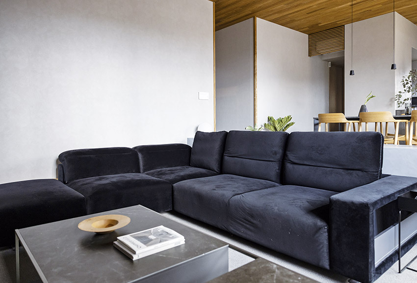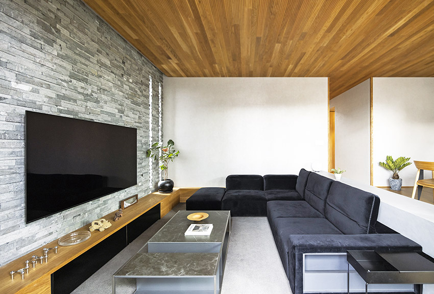 ロースタイルリビングのインテリアは、英郎さんから「ラウンジのような空間を」とリクエストいただきました。そこで、リビングの広さとのバランスを考え、ボリューム感のあるグレーのソファをご提案。座面が広く柔らかな座り心地なので、座ったり寢転んだり、お好きな體勢でくつろいでいただいています。心地よすぎて朝までここで眠られることもあるのだとか。