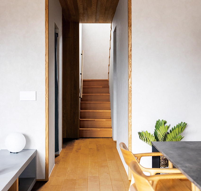 子どもたちが駆け回っても壁や床に傷が付きにくい工夫ができないかとご夫妻。そのご要望に応えるため、1階廊下とリビングの境界の壁に無垢材の見切りを付けました。クロスに傷が付きやすい角を保護するとともに、インテリアとしても素敵なアクセントになりました。