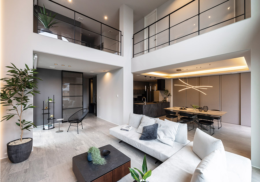 吹き抜けによって1階のリビングと2階ホールを一つにつなぎ、家族がどこにいても気配を感じられるように。大きな「H」型に見(jiàn)える壁が程よく空間を分けています。隨所に取り入れた黒いアイテムがインテリアを引き締める効果も。