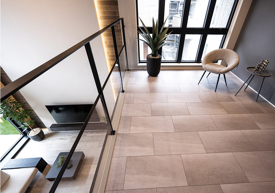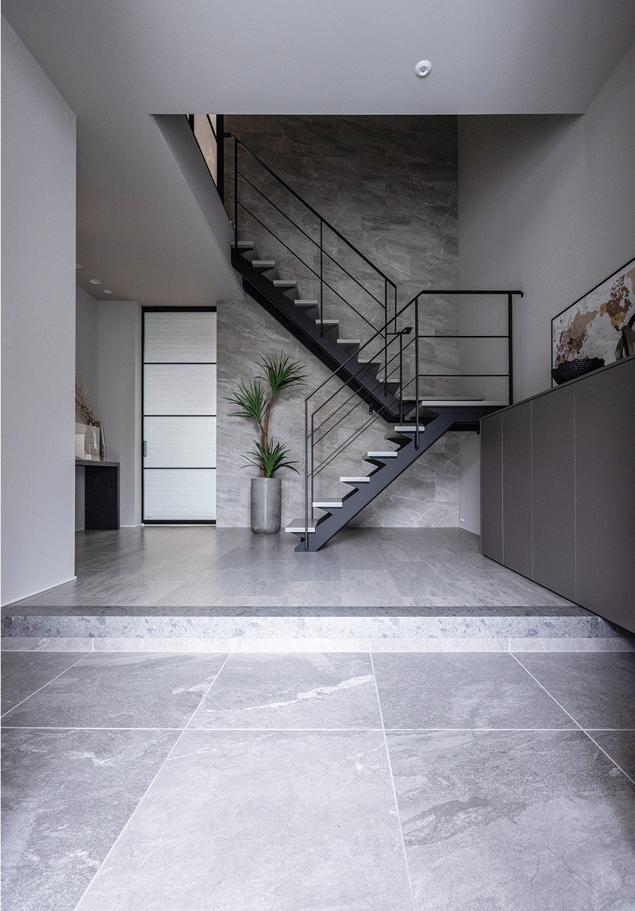 ちょっとした訪問(wèn)客の対応ができるよう、玄関は広めにレイアウト。正面にしつらえたスケルトン階段が空間を引き立てます。その左側(cè)の半透明のドアはLDKへと続いています。