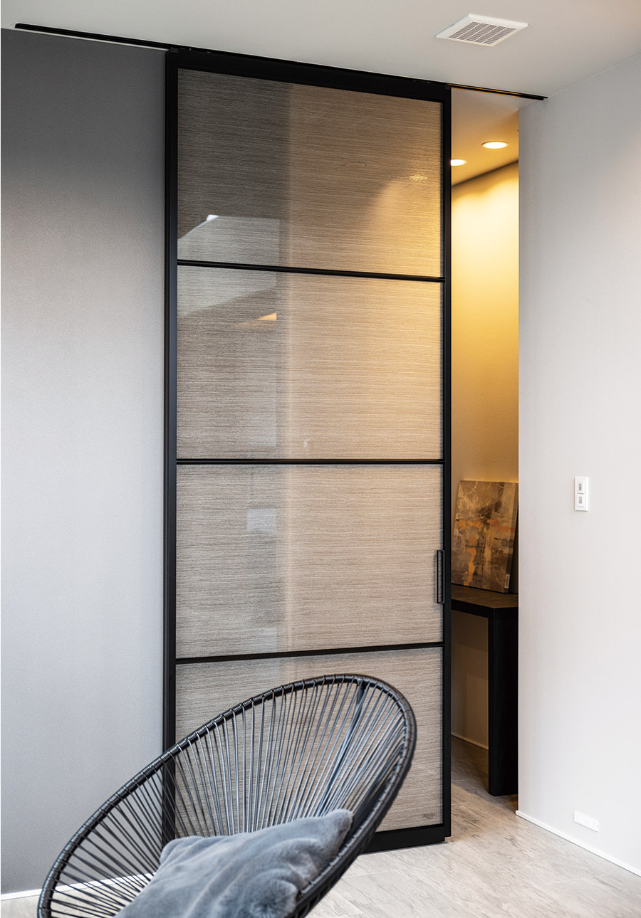 テラス側(cè)から入った自然光を玄関にも屆けるため、リビングドアには半透明のスクリーンをご提案しました。繊細(xì)なファブリックを挾み込んだ、機(jī)能と美観をかなえるアイテムです。