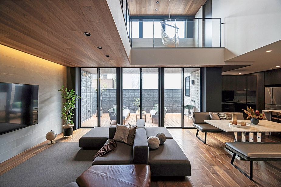 主寢室の2つの扉を開け放つと、フロアをぐるりと1周できる回廊になります。腰壁をガラスにすることで吹き抜けの開放感を一層高め、どこにいても家族を近くに感じられる空間となっています