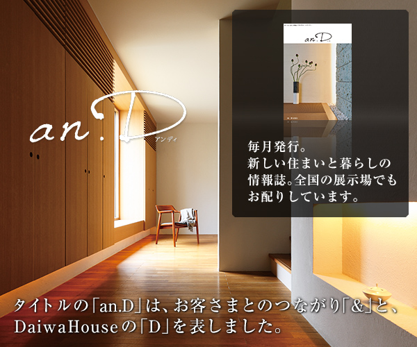 an.D アンディ タイトルの「an.D」は、お客さまとのつながり「&」と、DaiwaHouseの「D」を表しました。毎月発行。新しい住まいと暮らしの情報誌。全國の展示場でもお配りしています。