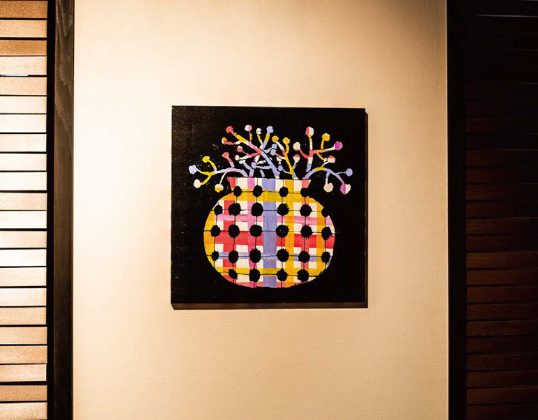 谷口さんのご自宅のリビングはギャラリーカフェのような趣。部屋の顔となる壁には大きく印象的なアートを。どこで出合い、どんな作家なのか、一つひとつの作品との思い出を語ってくださいました(artist:正面/あきやまりか)