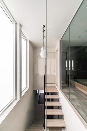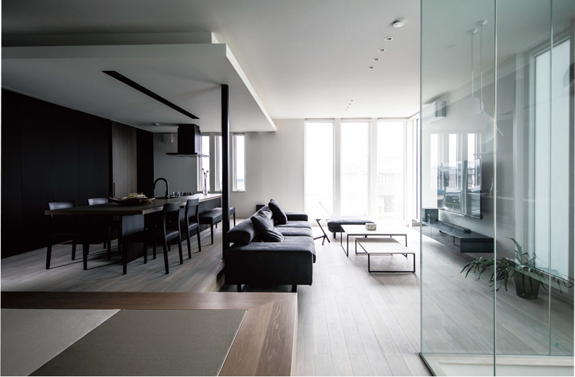 2階のLDK(上部寫真)は、床から天井までいっぱいに広がるFIX窓を配して柔らかな光が差し込む広々とした空間に。階段(上部寫真)の吹き抜け部分をガラス張りにしたことも、空間に抜けを生むひと工夫です。開放感がありながら空間は閉じているため、冷暖房が流れず快適な室溫を保つことができます。2つの球が浮かんだようなペンダント照明も、リビング空間のアクセントの一部。LDK橫にはタタミスペースも設け、洋風な住まいの中に和の要素を上手く盛り込みました。