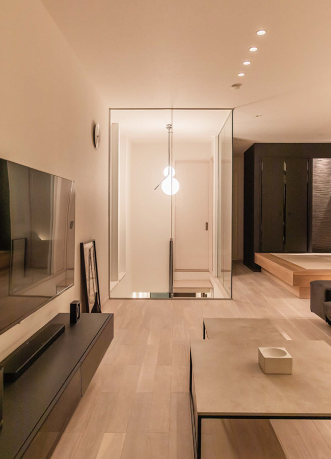 吹き抜けの照明がリビングにも屆くようガラス張りに。奧行きと開放感を演出します