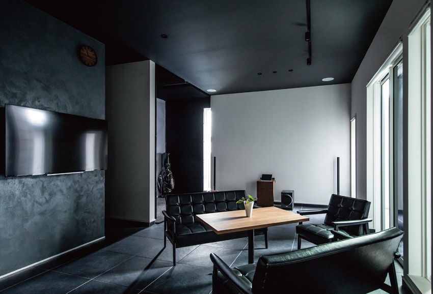 お客さま用のセカンドリビングは黒をベースとしたシックな印象に。革張りのソファが空間を引き締めます