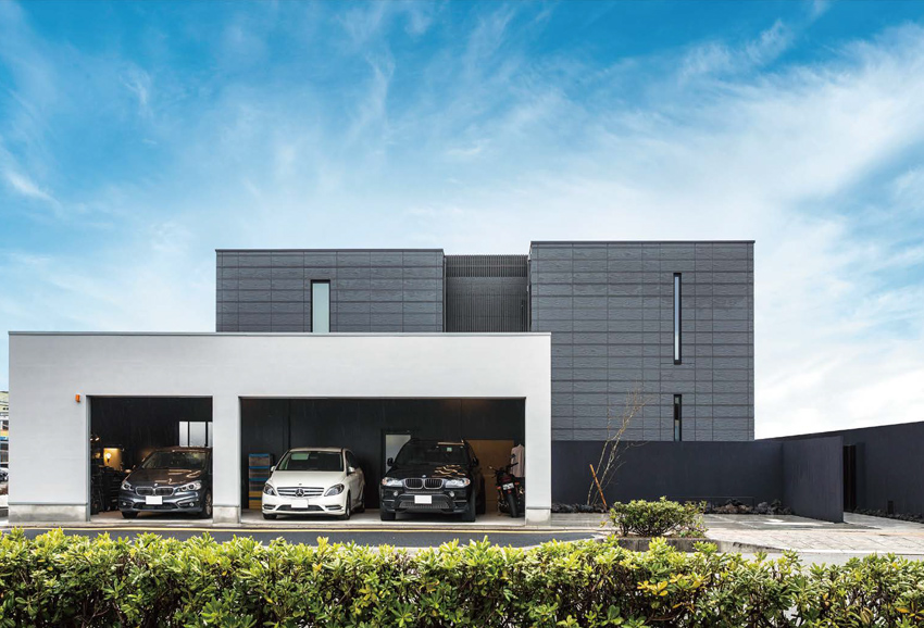 外観は2つの箱が並ぶイメージでスタイリッシュに。道路側はスリット窓でプライバシーに配慮。バルコニーには縦格子をあしらうことで視線を遮りながらデザイン性も確保しています
