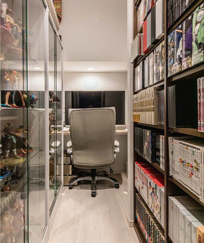 1階には自分の世界に浸れる趣味の部屋も。Sさんのコレクションがずらりと並ぶ書斎は、さながら秘密基地のよう