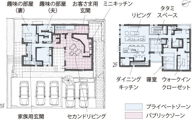 「友人の集まる空間とプライベート空間を明確に分けること」をコンセプトにしたOさま邸の特徴は、玄関と階段が2つずつあるユニークな間取り。北側のお客さま用玄関から続く1階はパブリックゾーンとして、南側の家族用玄関から階段を上がると広がる2階はプライベートゾーンとして、2つの空間を切り分けつつ共存させています。