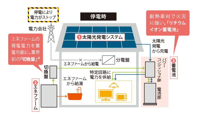 停電時(shí)には1太陽(yáng)光発電システム 2エネファームでつくった電気を 3蓄電池に貯め、生活に必要な電気を供給し続けます。