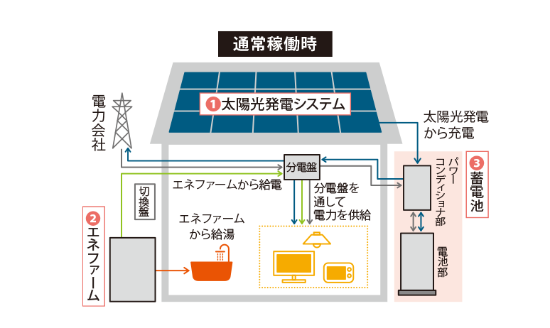 1太陽(yáng)光発電システム 2エネファーム 3蓄電池の3つの電池が連攜し、効率的に電気を供給します。