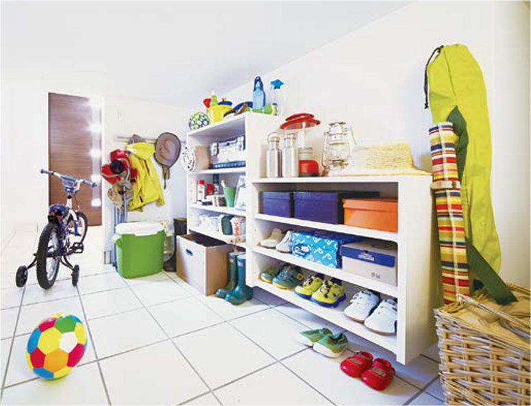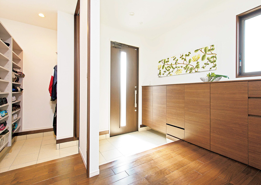 玄関をお客さま用と家族用で分け、家族側に収納をまとめてしまえば、お客さま側はいつもすっきり。屋外で使うおもちゃなど部屋に持ち込みたくないものは、玄関収納にしまいましょう。