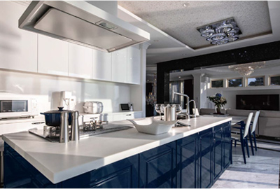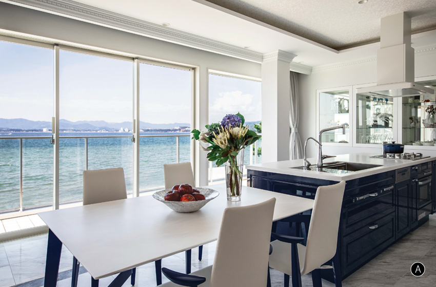 自然の景色に癒やされながら料理や食事の時間を楽しみたい。そんな願いをかなえたのは靜岡県のSさま(寫真A)。海のすぐそばという立地條件を贅沢(ぜいたく)に生かしたオーシャンビューのキッチンです。扉材の色はSさまが大好きだというロイヤルブルー。爽やかな海の色と相まって、美しく調和した空間が生まれました。