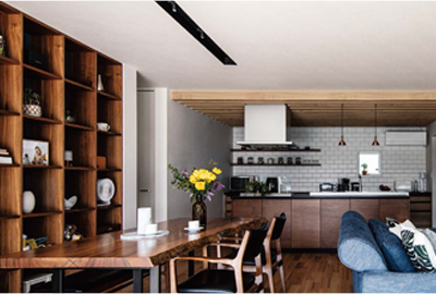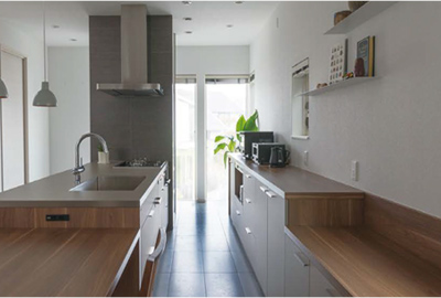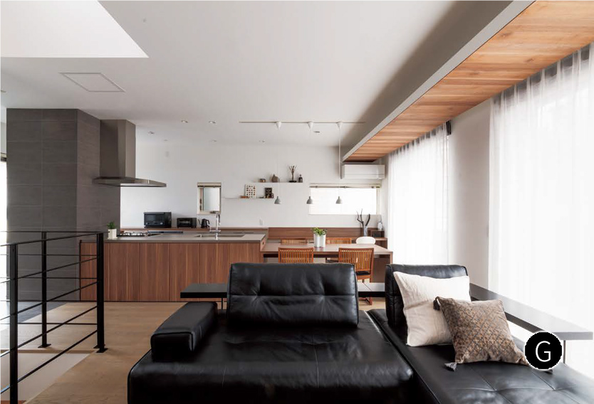 2階をほぼワンルームのLDKとして計畫したのは大阪府のNさま(寫真G)。オープンな空間だからこそ、上質な家具のように木目の美しいキッチンを選ばれました。背面の窓の位置や飾り棚のバランスにもこだわっておられます。