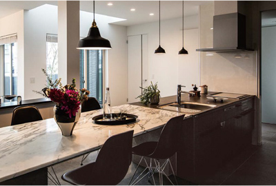もともと所有されていた大理石のテーブルとキッチンの高さを合わせ、すっきりとした空間デザインを実現