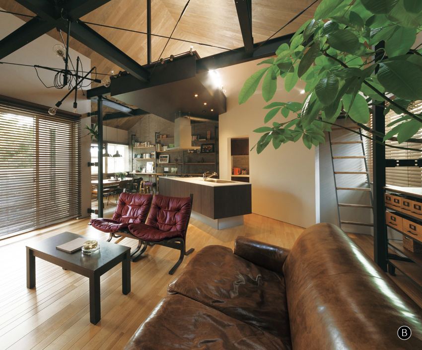 大阪府Kさま邸のLDKは、天井の構造梁(ばり)をあらわしたブルックリンスタイル(寫真B)。ダイニング(寫真左奧)とリビング(寫真手前)の中間地點に、シンプルなアイランド型キッチンが斜めに據えられています。斬新なレイアウトもさることながら、驚くのはモノの少なさやシンプルさ。大小の電化製品や調理道具、ストック食品や食器など、キッチン回りにあふれがちなものを全て背後のバックヤードにまとめておられます。
