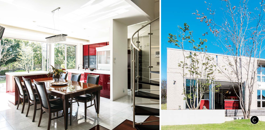 華やかな赤茶色のキッチンを空間のアクセントとしてコーディネートされたのは、福岡県のMさま(寫真C)。艶(つや)やかな色が大理石の床に反射し、ラグジュアリーな雰囲気を醸し出しています。大切な人をもてなすホームパーティーを意識し、掃き出し窓から芝生の庭に出入りしたり、らせん階段で上下階を行き來したりと、ゲストが自由に移動して楽しめる設計になっています。