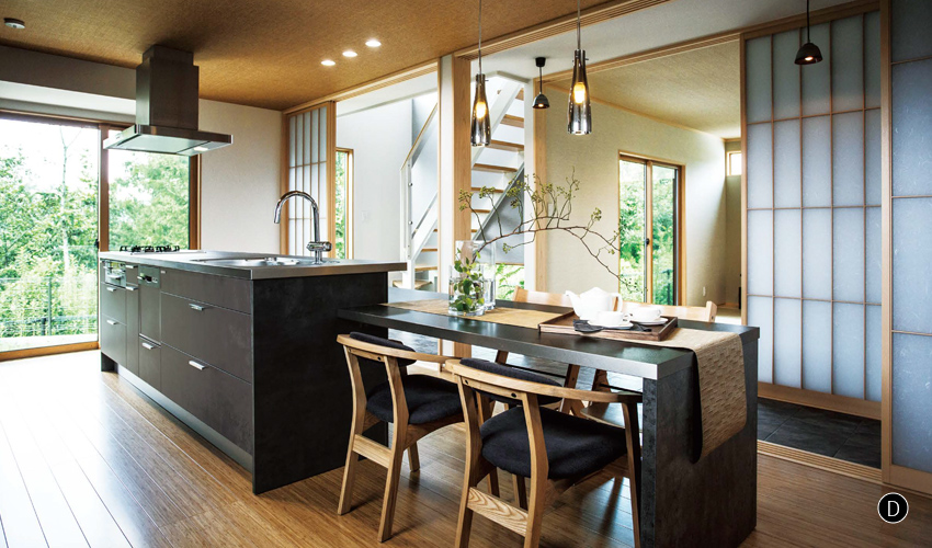 奈良県のIさまのキッチンは、障子を多用した和のインテリアに美しくなじむ端正なたたずまい(寫真D)。障子の仕切り方によって、廊下を挾んで向かいにある和室や階段ホールと多様につながり、シーンに応じた空間アレンジが可能です。また、キッチンに面した庭にはバーベキュースペースも。內と外の連動で、ひときわ楽しい食の時間を味わうことができます。