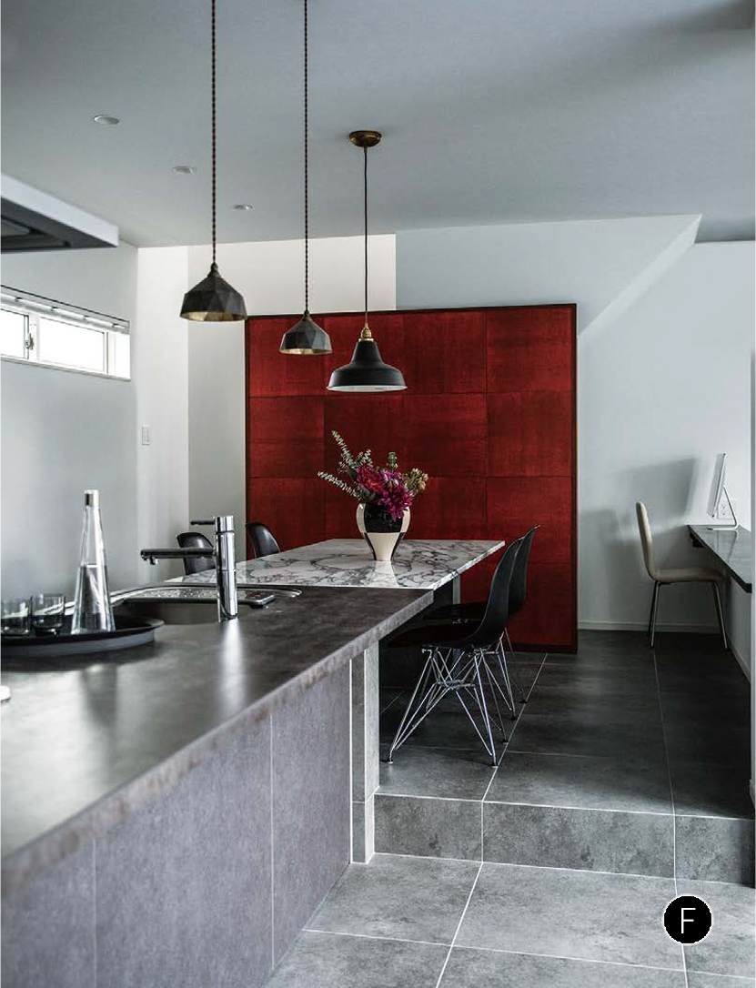 シンプルモダンなダイニング?キッチンに、赤い和紙のアクセント壁で個性を添えたのは、福井県のYさまです(寫真F)。アーティスティックなアクセント壁の向こうには階段があるのだとか。ダイニングの床を一段上げているのは、キッチンに立つ人と視線が交わるようにという配慮からです。