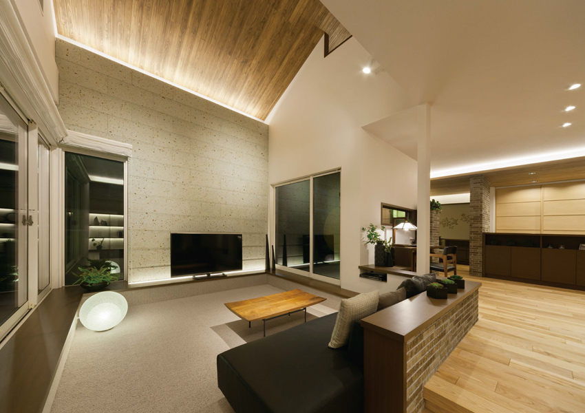 勾配天井を照らす間接照明を中心に、スタンドライトやスポットライトを組み合わせて「一室多燈」を実現。天井や壁の素材感が照明によって豊かな表情に変化します