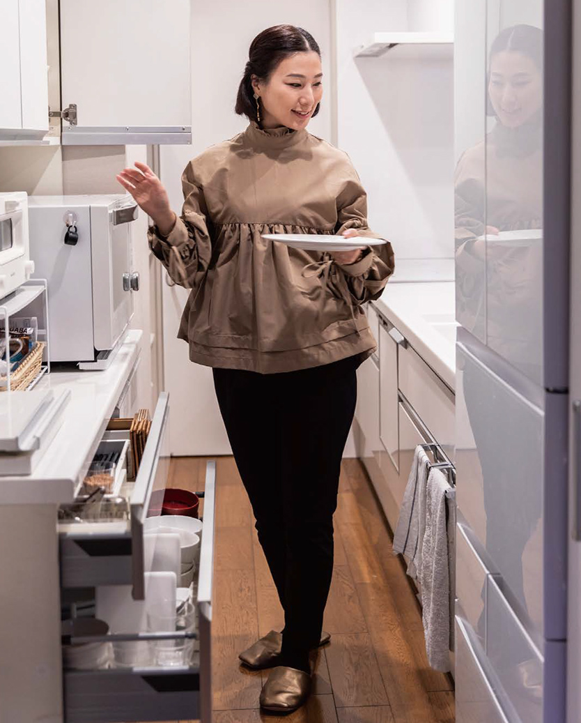 キッチンの使いやすさのカギは、作業動線と収納場所が合っているか。動線を意識して、何をどこに置くのか決めるのがポイントです。西口さん宅のキッチンは、シンクで食器を洗って乾かした後、振り向くだけで食器棚に片付けられるレイアウト。歩き回る歩數が少ないほど、調理や片付けの過程での無駄な動きを減らせ、使いやすいのです。