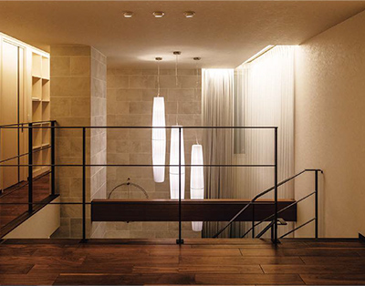 シャープな直線やモノトーンの素材で構成したミニマルなお住まいを実現されたのは、奈良県のYさまです(寫真B)。ミニマリストであるご夫妻は、可能な限りノイズを減らした美しくシンプルなインテリアを希望されました。リビングは吹き抜けの天井に間接照明を採用することで「あかり」の存在感を消しつつ、空間全體に明るさを確保する手法が用いられています。
