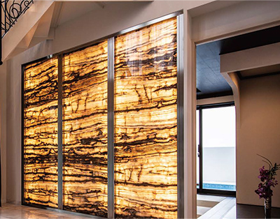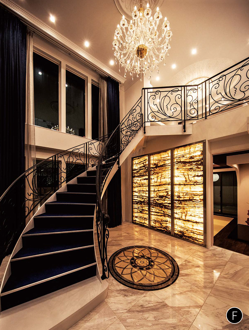 対照的に、きらびやかなエレガンスを追求されたのは靜岡県のSさま(寫真F)。高さ5mを超える吹き抜けの玄関ホールには、豪奢(ごうしゃ)なシャンデリアが燈(とも)ります。さらに、和室と玄関を隔てる壁には、自然石とLED光源を組み合わせた「光壁」をはめ込みました。他にはない圧倒的なデザインで、住まいの顔である玄関を演出しています。