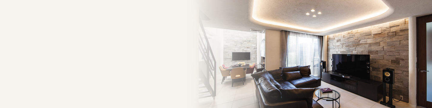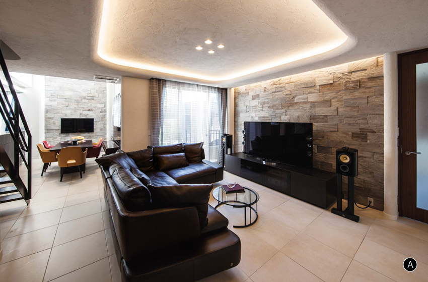 奈良県のBさま邸は、自然素材と曲線を生かしたデザインが特徴的なお住まいです(寫真A)。リビングの折り上げ天井や割れ肌自然石材のアクセント壁に間接照明が埋め込まれ、空間全體に柔らかい明るさをもたらしています。光が當たることで漆喰(しっくい)仕上げの陰影や石表面の凹凸感が際立ち、品格のある印象的なインテリアになりました。