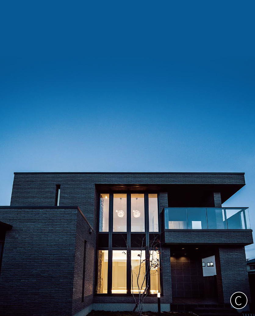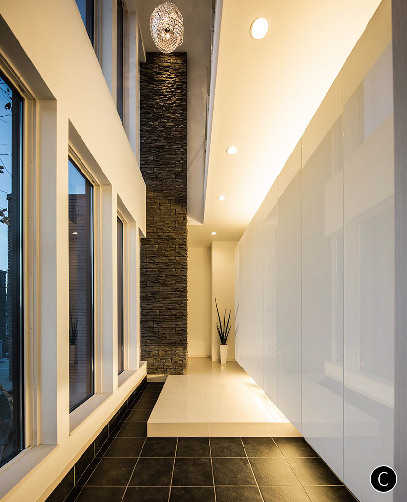 美しく効果的な照明計畫は、室內を彩ると同時に、外から見た我が家の佇まいを印象的に表現するアイテムになります。福井県のYさまは、“魅せる玄関”をテーマに、2つのペンダント照明で內と外を演出されました(寫真C)。玄関の吹き抜けにつるしたクリスタルオーナメントの照明、シューズボックスの上下に埋め込んだ間接照明などが相まって、夕景に際立つ表情が生まれています。