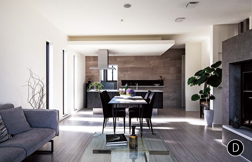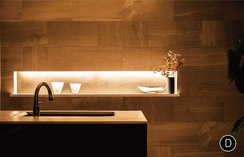 寫真に映える美しさと機能性を住まいに追求されたのは、大阪府のSさまです(寫真D)。シンプルなアイランドキッチンの背面にニッチを設け、照明をオン。飾ることに特化したスペースには、花やお気に入りの食器、オブジェなどをディスプレーする楽しみがあります。グレージュ(グレーとベージュの中間色)のフローリングをベースにまとめたインテリアは、晝と夜でまったく異なる趣を見せることができます。