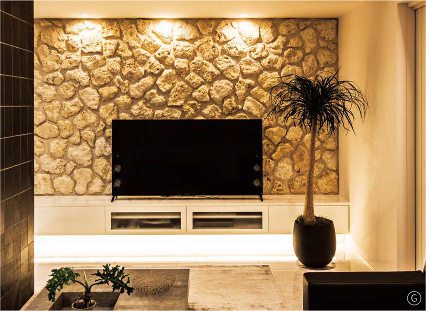 サンゴ石のゴツゴツとした質感を生かしたのは、石川県のKさま邸のリビングです(寫真G)。石をあしらったテレビボードの壁面にスポットライトを燈せば、陰影豊かな表情が生まれ、非日常を味わうことができます。