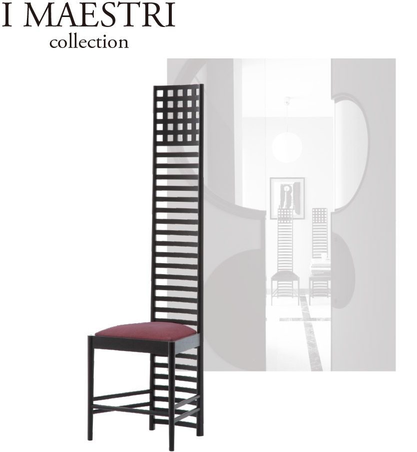 チャールズ?レニー?マッキントッシュが1902年にデザインしたヒルハウスチェア。梯子のようなハイバックで、椅子を座るだけでなく鑑賞するものとしても捉えた作品といわれています。最上部の格子(こうし)は日本建築の影響を受けたとされ、日本的な美しさも感じられます。オリジナルは今なお彼の代表建築「ヒルハウス邸」の寢室に置かれています。