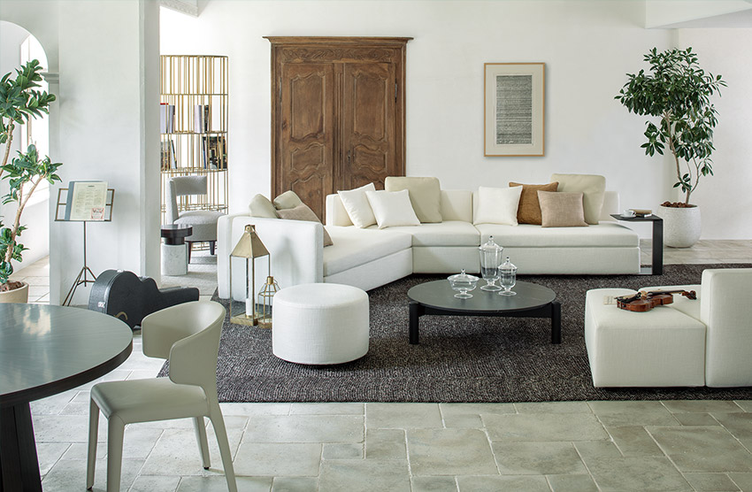 カッシーナの家具は、その美しい佇まいに加え極上の快適さをもって、住まいでのひとときを格別なものにしてくれます。デザインに惚(ほ)れ込んで購入するのはもちろん、その家具とともにどう暮らすかを想像して選ぶのもお勧めです。リビングでゆったりとくつろぎたいなら、橫たわって全身を預けることができる奧行きあるソファを選びましょう。ライフスタイルに合わせて検討することで、永く愛せる一品に出合えるはずです。