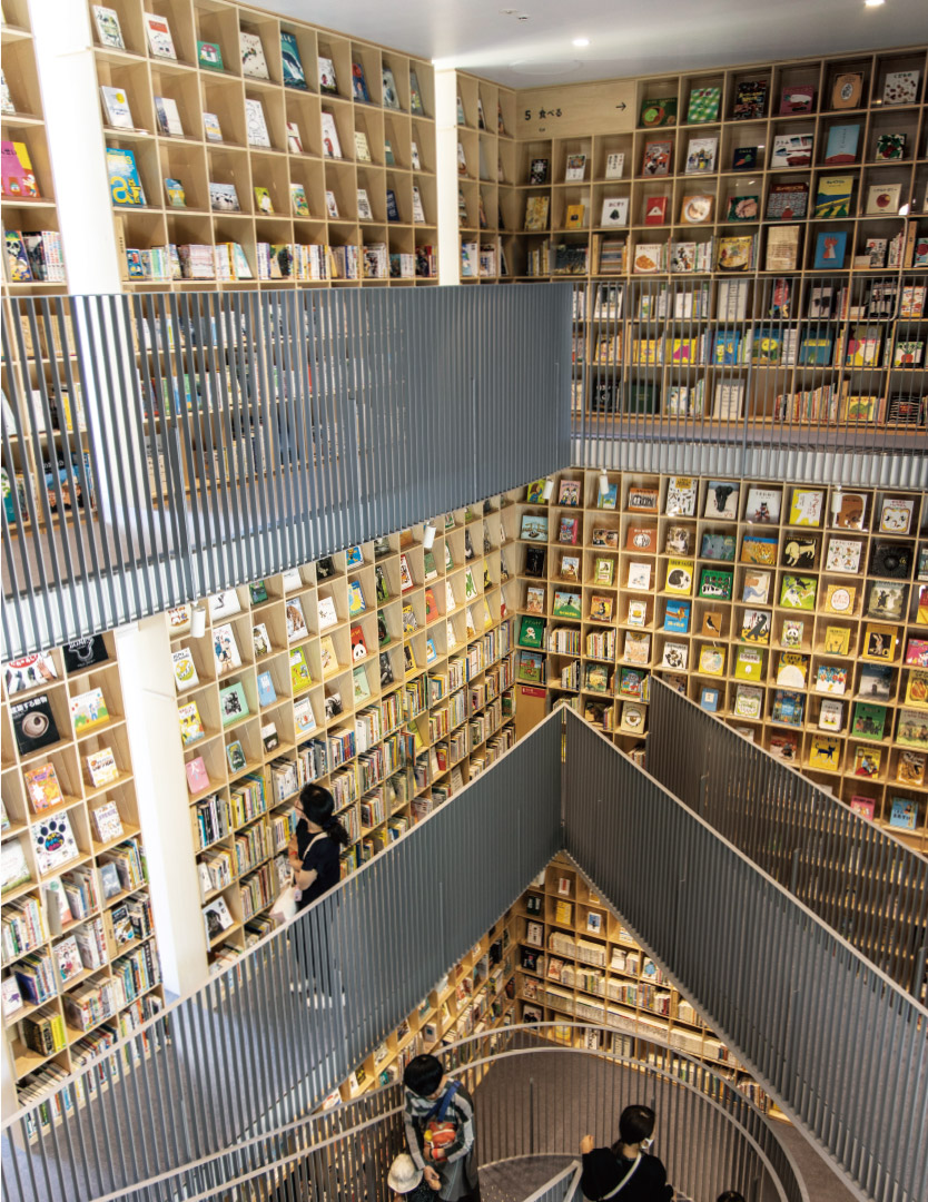館內(nèi)に足を踏み入れると、そこは立體迷路のように階段やブリッジ通路を巡らせた3層の吹き抜け空間。あちらこちらで本を広げる子どもや、懐かしい本に目を輝かせる大人達(dá)がそれぞれの時(shí)間を楽しんでいるのが目に入ります。四方を囲む全ての壁が本棚になっていて、まさに「本の森」に迷い込んだかのように、冒険気分で館內(nèi)を子ども達(dá)が歩き回っています。「自分自身で面白さを見つけ、ワクワクしながら自由に読書を楽しめる場(chǎng)所になってほしいです」と館長(zhǎng)の前川千陽さんは語ります。