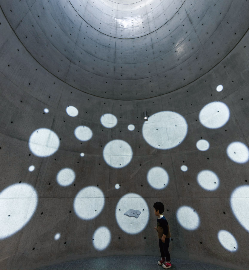 建物の至るところに、本に興味をもつ仕掛けが施されています。靜寂に包まれた?jī)彝菠慰臻gもその一つ。響く聲や少しひんやりとした空気が非日常を感じさせます。ここでは児童書の物語の一片がプロジェクションマッピングで紹介され、紙の本になじみのない子ども達(dá)が物語に興味をもつきっかけを生み出しています。