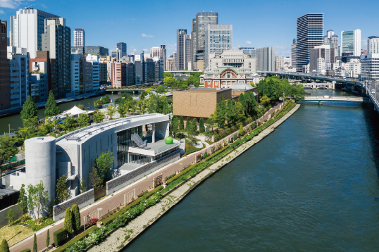 安藤建築の特徴であるコンクリート打ち放しの外観。緑に映え、中之島の景色になじみます
