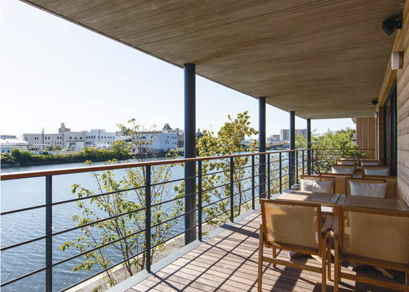 ベーカリーカフェ「ポットメイドベーカリー」のテラスでは、中川運河の川面を眺めながら軽食が楽しめる
