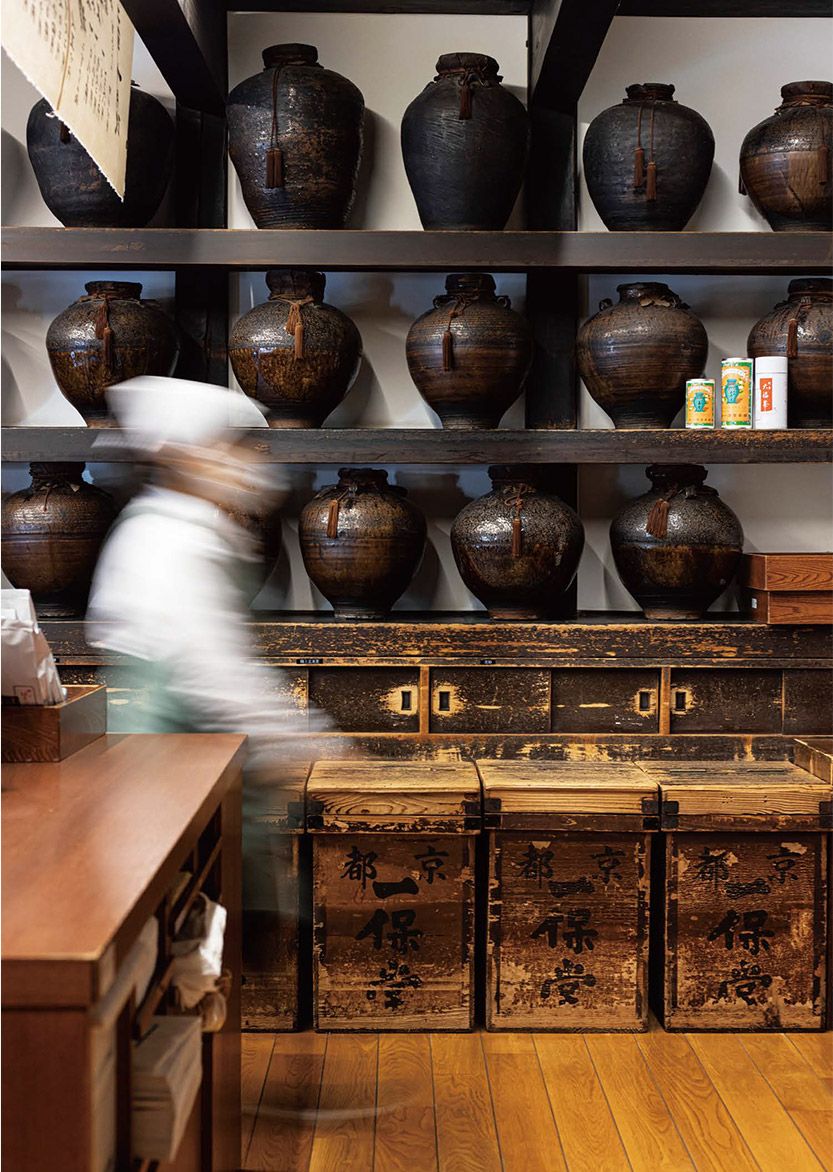 かつて茶葉の保存に使われていた茶つぼや茶びつが並ぶ店內