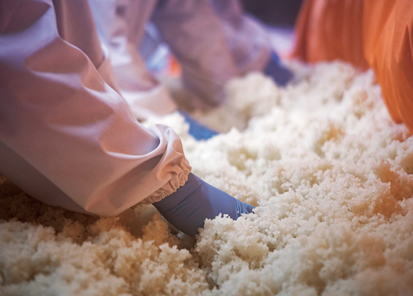 蒸した米に種麹をかけて米麹をつくる「麹室(こうじむろ)」の作業風景。室溫や濕度を最適な狀態に保ち、デリケートな麹菌を大切に育てます