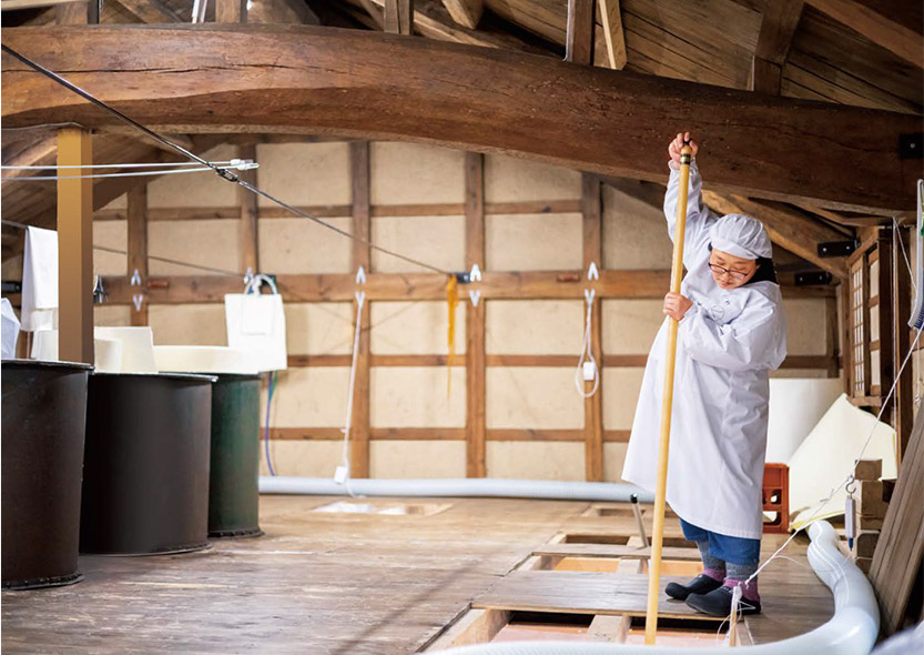 仕込み蔵の2階の作業場で1階のタンクの中をかきまぜる久仁子さん。竿がぶつかりにくいよう梁を高く上げた合掌造りの建物は築100年を超えています
