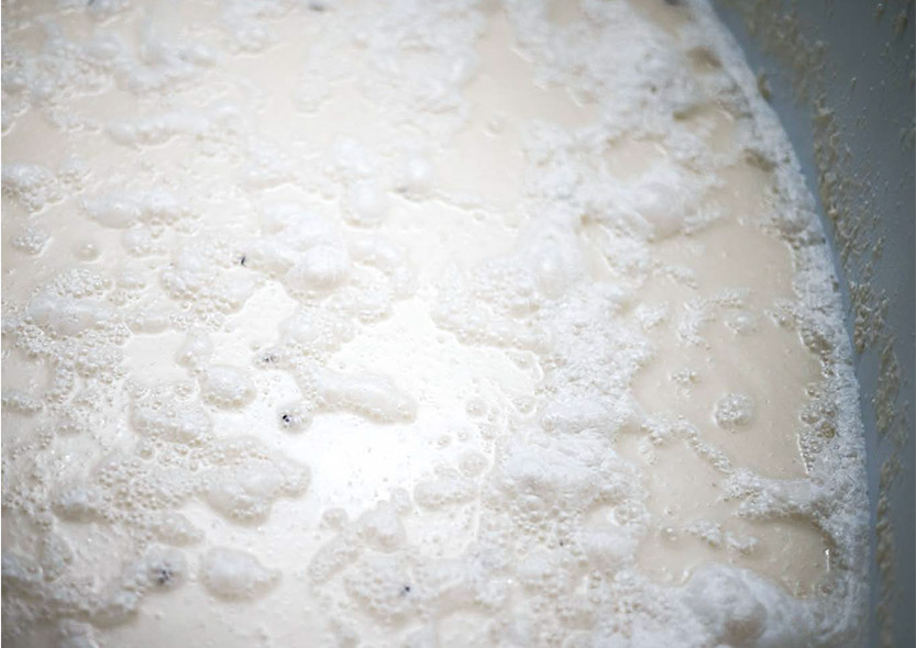 醪(もろみ)が発酵する様子。巨大なタンクに酒母(しゅぼ)を入れ、その後3回に分けて醪を加え、発酵させます