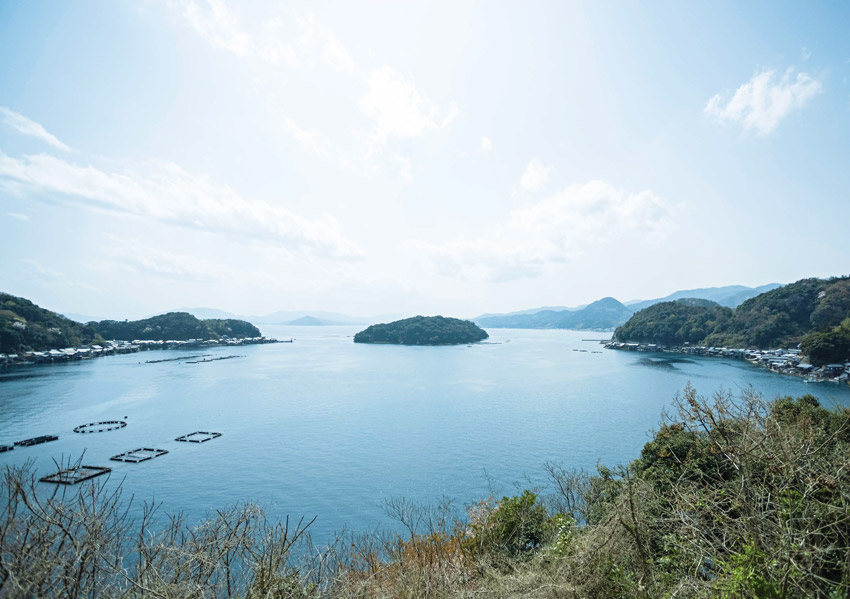 神の宿る「青島」(正面)が防波堤の役割を果たし、伊根灣はいつも穏やかな表情を見せています